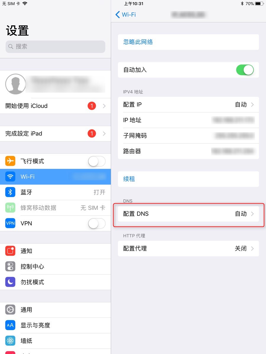 3. 在该 Wi-Fi 网络详情的下面找到 “ DNS ” 选项部分